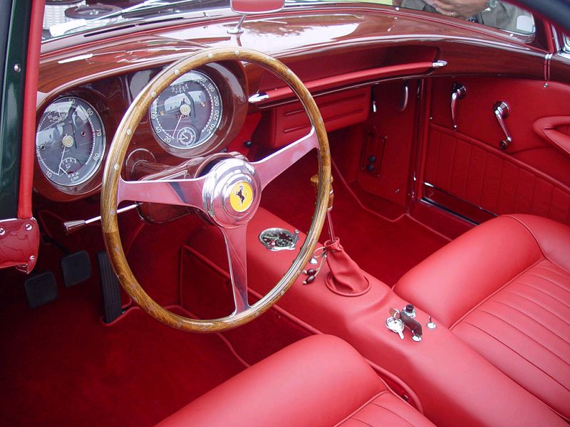 The interior of the 375 America Coupé Speciale was tailored to perfection. Full leather upholstery, fine wood or painted trim, and an elegantly arranged dashboard with Jaeger instruments created a luxurious yet purposeful driving environment. This model was as much a statement of power and wealth as it was a high-speed machine, and every surface reflected that ethos.