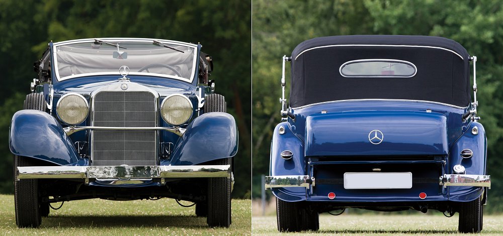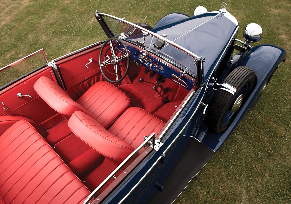 The Sindelfingen-built bodywork gave the Cabriolet D an unmistakably dignified presence. Its four-door layout set it apart from the more compact Cabriolet A and B variants, offering easy entry and exit for passengers. The proportions were elegant and balanced: a long bonnet, sweeping wings, tall side panels and a spacious passenger compartment covered by a large, high-quality folding roof. With the roof raised, the car appeared formal and limousine-like; with the roof lowered, it transformed into a grand open tourer with impressive visual presence. Chrome accents and fine detailing added a touch of understated luxury without excessive ornamentation.